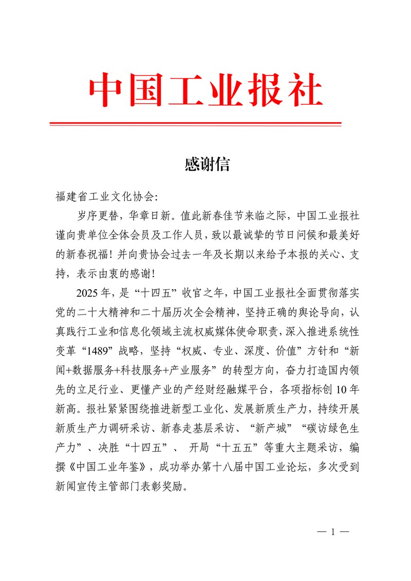 值此新春佳节,中国工业报社向协会发来感谢信。信中,中国工业报对协会全体会员及工作人员致以诚挚问候,并对我会长期以来、特别是马年春节前夕全力支持其全媒体报道组及“寻找新质生产力领跑者案例”调研组深入厦门、走进协会多家会员企业一线采访表示衷心感谢。