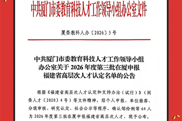 近日,中共厦门市委教育科技人才工作领导小组办公室发布《厦委教科人办〔2026〕5号》文件,协会副会长、厦门市铂联科技股份有限公司吴永进等三位核心管理者凭借卓越的产业贡献与创新能力,成功入选2026年度第三批福建省高层次人才认定名单。